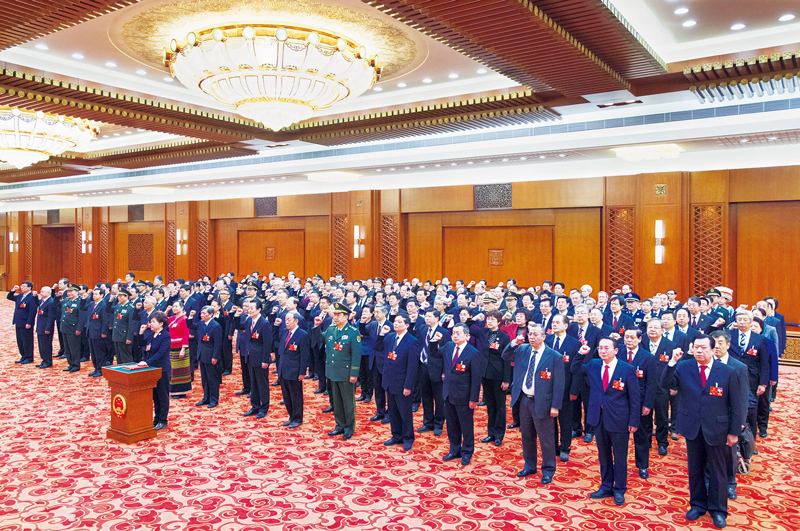 2018年3月18日,十三届全国人大一次会议在北京人民大会堂举行第六次全体会议。图为新当选的第十三届全国人民代表大会常务委员会委员进行宪法宣誓。 新华社记者 李学仁/摄