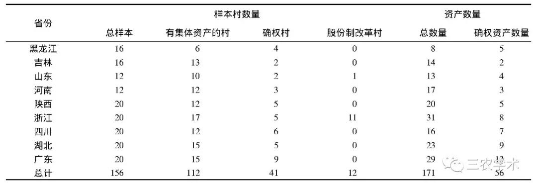 调研内容主要涉及村集体资产与投资活动、产权制度改革进度、村社会资本、市场环境等基本情况。在集体资产方面, 除涉及集体经营性资产外, 还包括村集体资源类资产 (不含农户承包的耕地和林地) 以及非经营性资产 (主要是校舍) 的现状*。2017年初课题组对所有样本村进行了回访, 以了解村集体资产确权和股份制改革的最新进展。