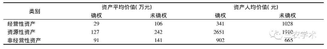 从资产平均价值角度来看, 各种类型资产确权进度存在明显差异 (见表5) 。首先, 无论是从资产平均价值还是人均价值角度来看, 经营性资产的确权进程明显落后于资源性与非经营性资产的确权。如表5所示, 未确权经营性资产平均价值 (106万元) 是已确权经营性资产平均价值 (29万元) 的近四倍, 而未确权经营性资产人均价值 (1028元) 也明显高于已确权的资产人均价值 (341元) 。其次, 从资产平均价值角度, 资源性和非经营性资产未确权比例大于确权;但从资产人均价值来看, 资源性和非经营性资产的确权比例远超过未确权的资产。以上结果可能与集体资产平均价值以及相关利益集团规模有关, 较高的集体资产平均价值与较多的利益相关者增加了农村集体资产确权的难度。